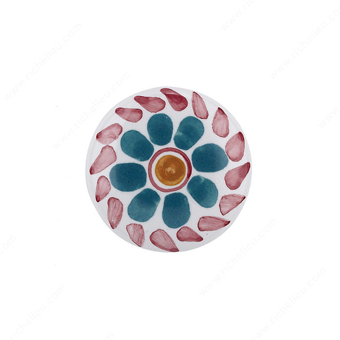 Bouton rond fantaisie en céramique à motif floral. Cet accessoire discret complétera le style de vos armoires de cuisine ou de salle de bain.