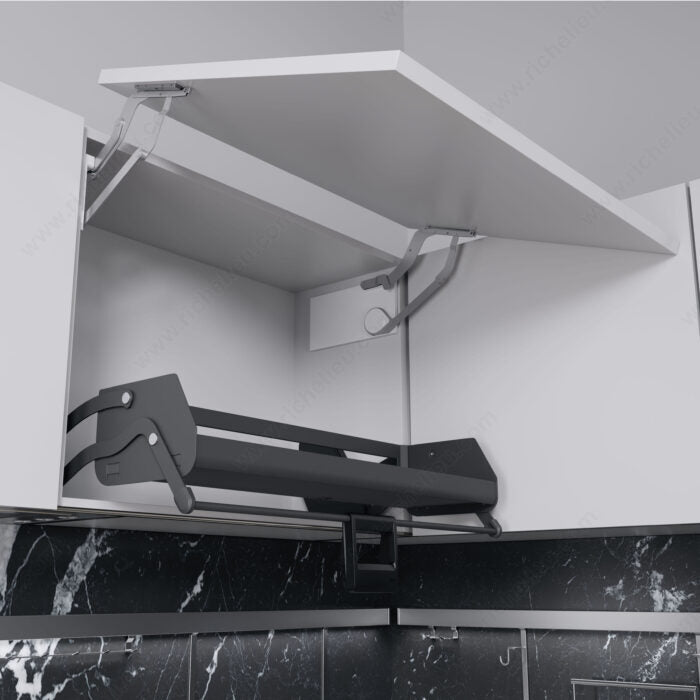 - Une fois rabaissées, les tablettes restent bien en position. Les étagères se rétractent ensuite dans le meuble en poussant la poignée vers le haut.