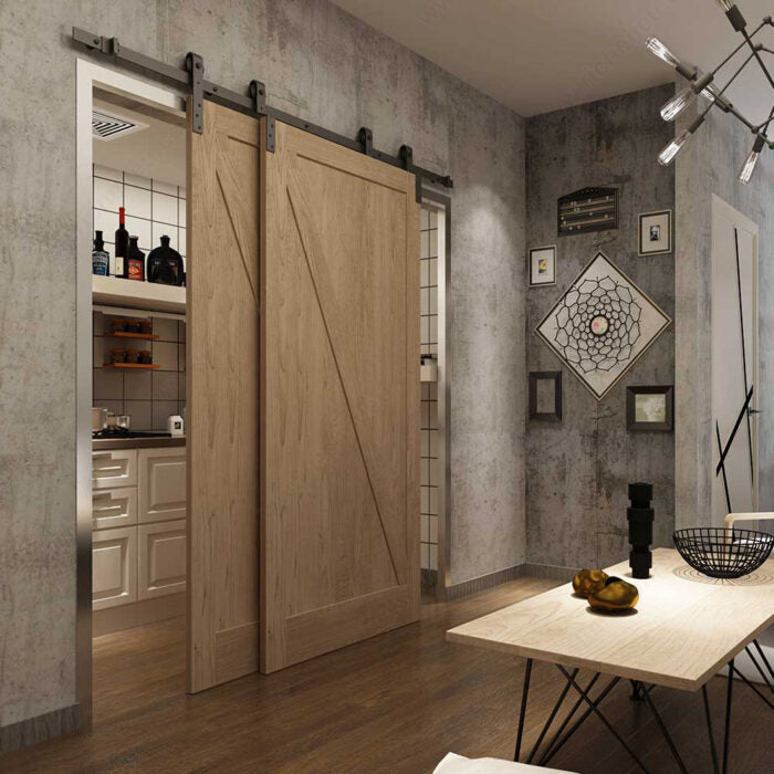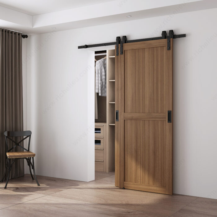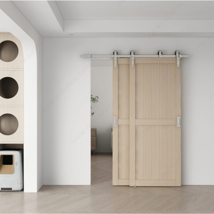 Ensemble pour porte de grange superposée RUSTIQUE à rail pour deux portes en bois pesant jusqu'à 220 lb (100 kg) chacune. Les supports et roulements à montage par courroie sont montés en surface sur la face de la porte et se déplacent sur le même rail unique.