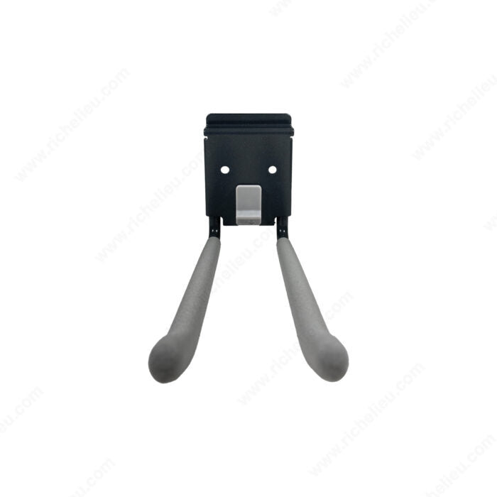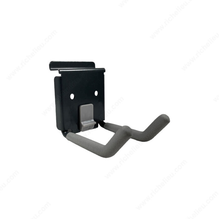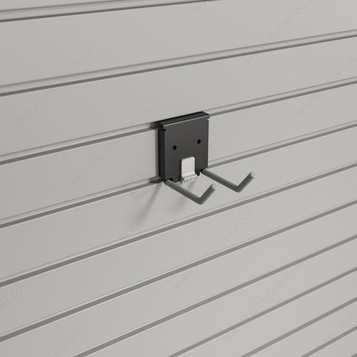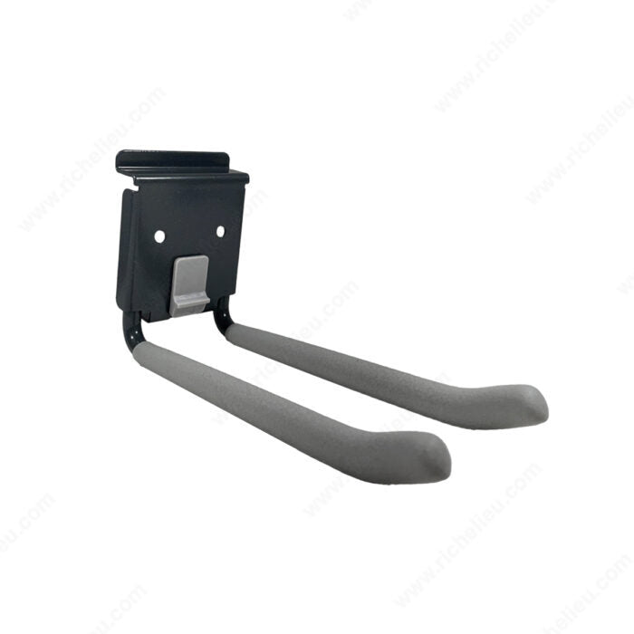 Le crochet double est un dispositif robuste et solidement fixé qui permet de garder à portée de main et prêts à l'emploi des outils de garage à manche tels que des râteaux, des pelles, des sacs à outils, des sacs de golf, et plus encore.