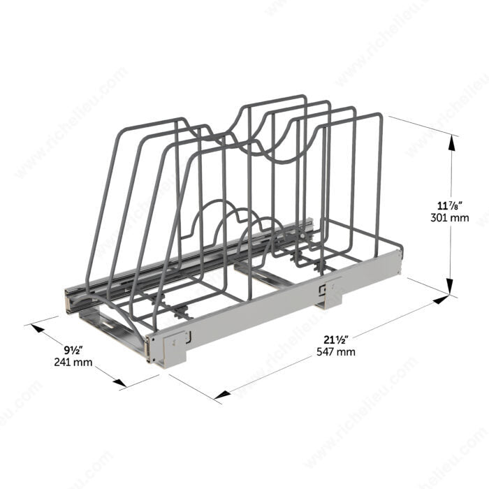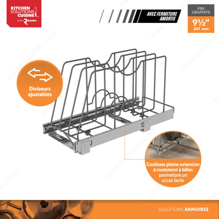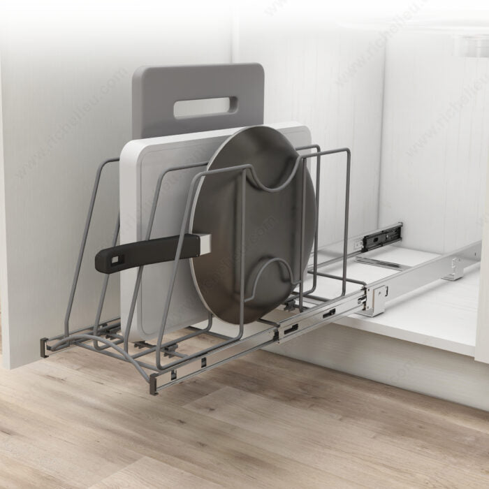 Accédez facilement à vos plaques de cuisson et planches à découper avec le diviseur coulissant Richelieu, à fermeture amortie. Ce système de rangement pratique est équipé de coulisses à extension complète pour que vous puissiez le retirer et récupérer instantanément votre équipement de cuisine. Les séparateurs individuels sont réglables pour s'adapter à vos besoins en matière de cuisson. C'est la solution parfaite pour ranger des articles tels que des tôles à biscuits, des moules à muffins, des moules, des couvercles de casseroles, des pierres à pizza, des planches à découper, des plateaux de service, etc. Grâce au mécanisme de fermeture amortie, l'organiseur se remet en place silencieusement. Doté d'une capacité totale de 20 kg (44 lb), il est idéal pour ranger une variété d'articles plus lourds. Cette solution de rangement de cuisine essentielle est conçue pour être utilisée avec des armoires de base avec ou sans cadre.