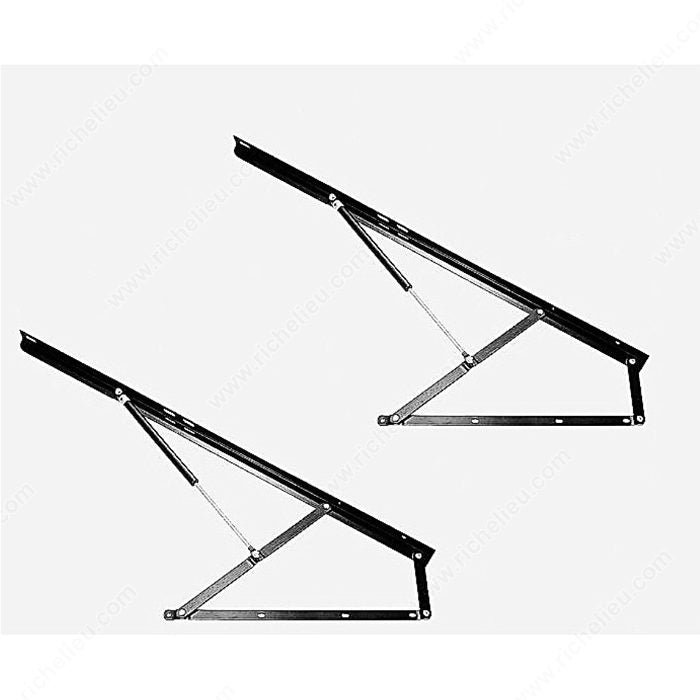 Hydraulic mechanism for under-mattress storage. Includes heavy-duty steel brackets, powder-coated black, along with screws for bed deck mounting, and gas pistons to hold the bed in a raised position.