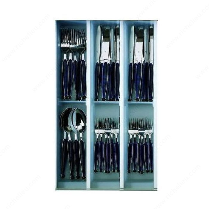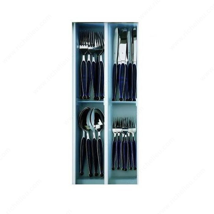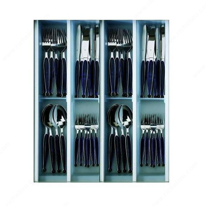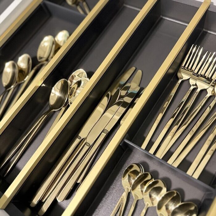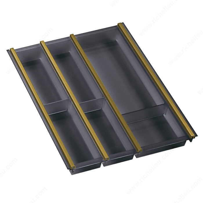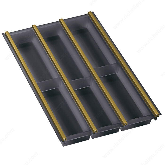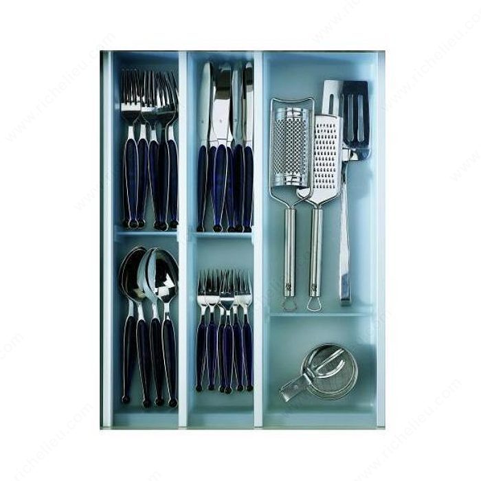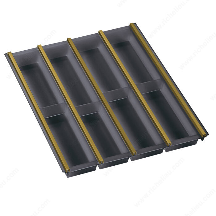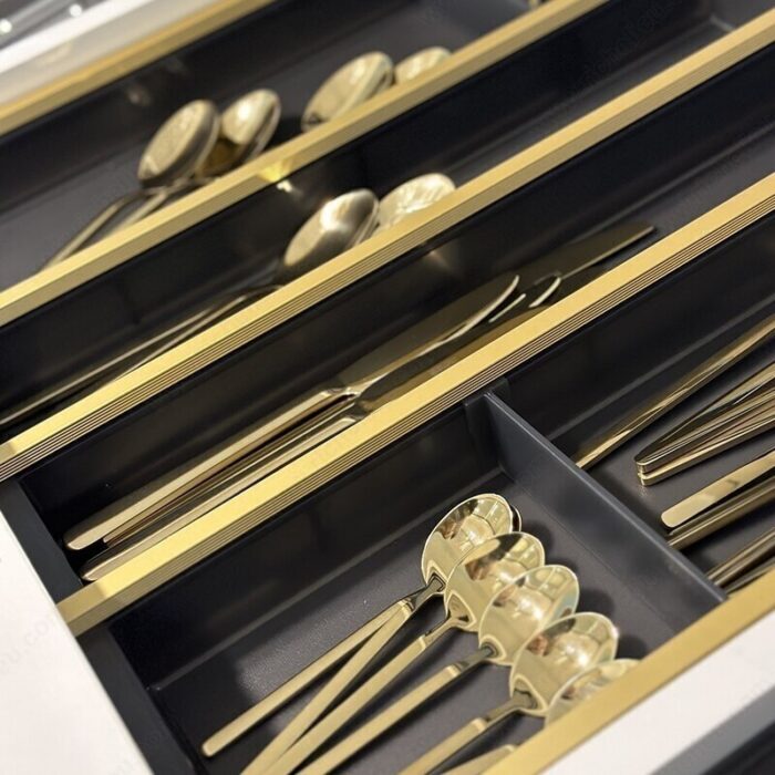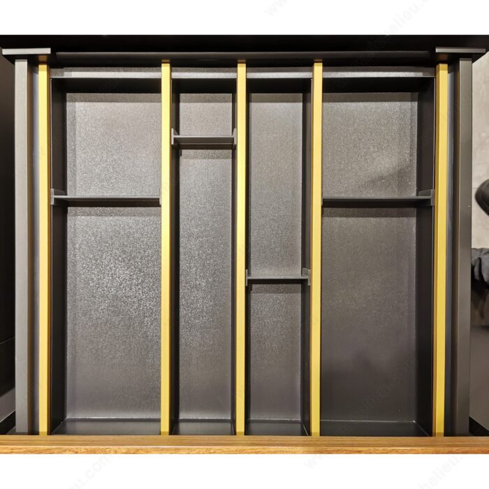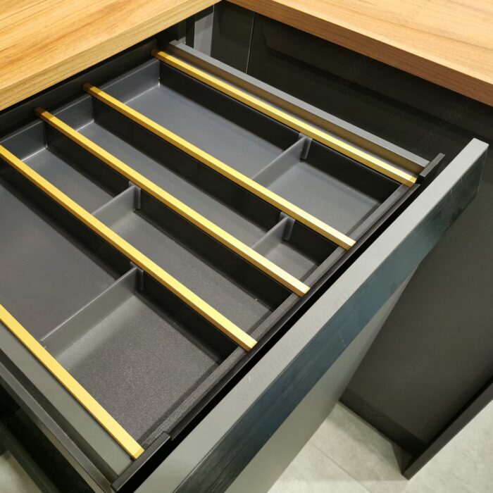 The CUISIO utensil and cutlery tray kits are modular systems held together by aluminum profiles for a practical and elegant look. The small dividers within each compartment can also be moved and fixed to your desired locations.